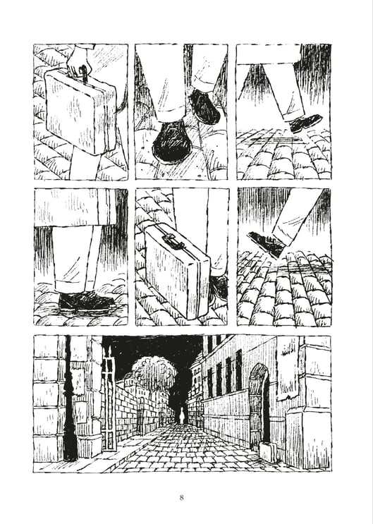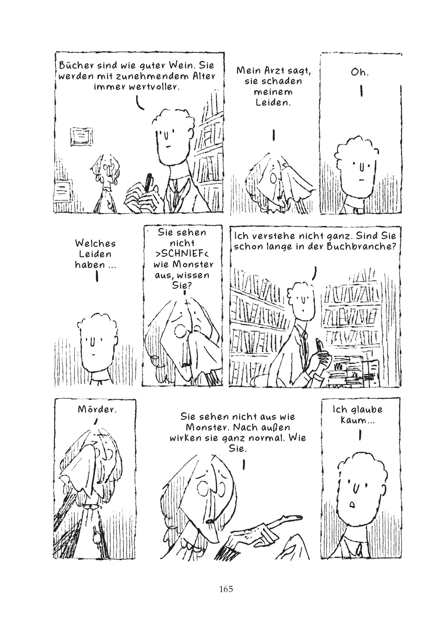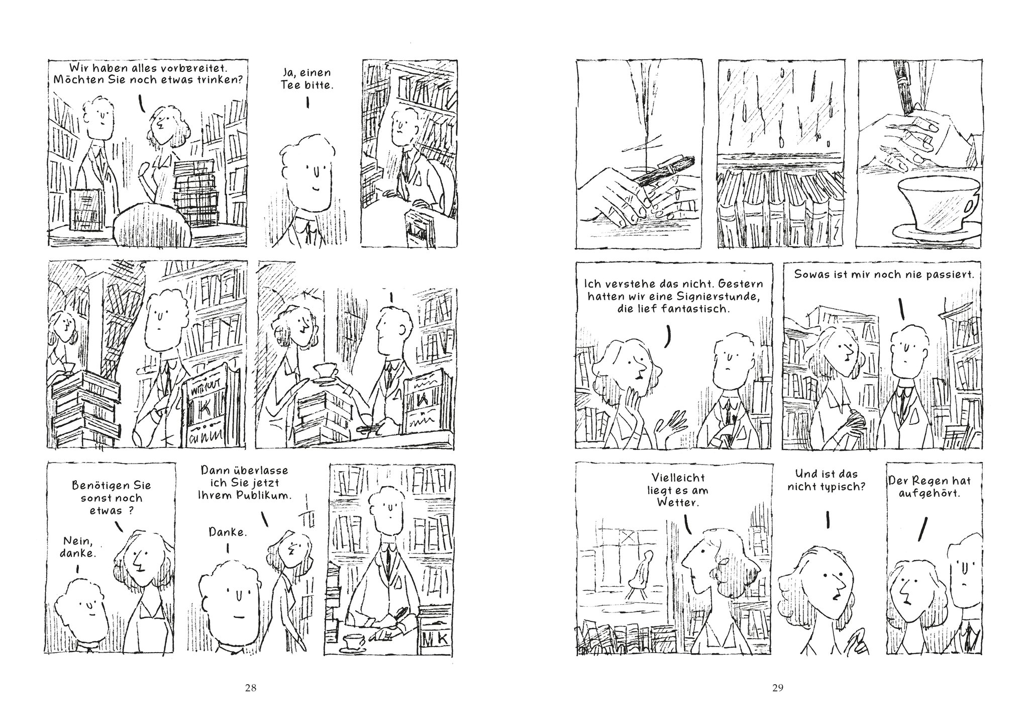 »In schwarzweißen Zeichnungen – sparsam bei den Figuren und den pointierten Dialogen, voller Details bei Architektur, oder den vollgestopften Regalen der Buchläden [...] – treibt