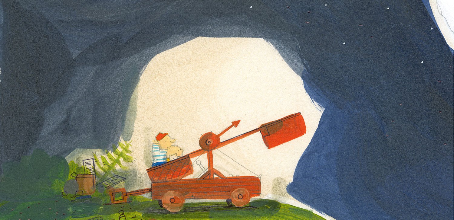 Großvater ist ein unerschrockener Abenteurer, ein grandioser Erfinder und ein großer Geschichtenerzähler. Für seinen Enkel baut er ein Katapult, damit beide zum Mond reisen können. Dabei trägt er wie immer seinen kleinen roten Hut. Später, irgendwann einmal, in ganz ferner Zeit oder vielleicht schon morgen, wird er den Hut seinem Enkel vermachen, damit dieser die Geschichte fortführt.