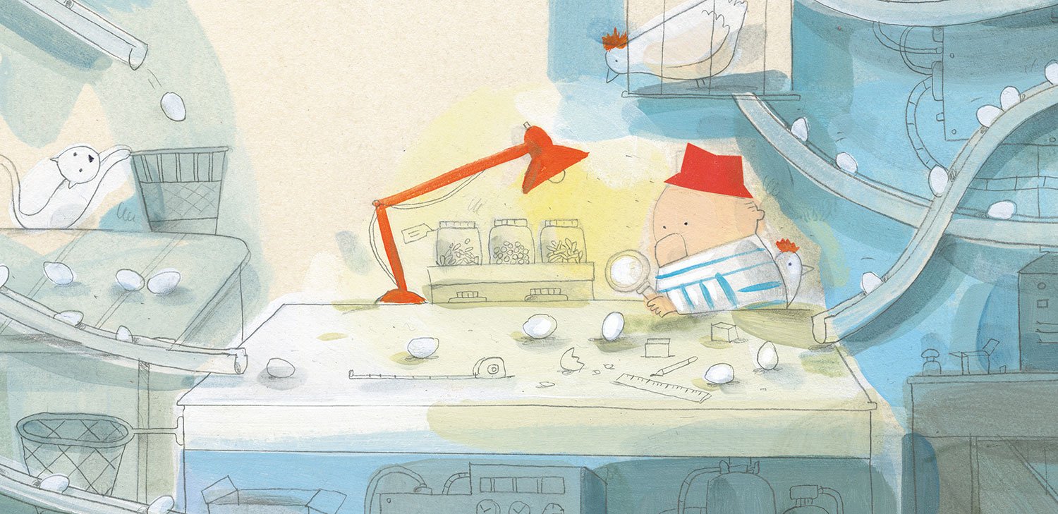 »Wenn mein Opa ein merkwürdiges Ding auf der Straße findet, hebt er es auf, repariert es und erweckt es zu neuem Leben. Dann wird es plötzlich ein Scheinwerfer, ein Rückspiegel oder ein Steuerknüppel für sein Raumschiff. Er sagt, dass er der Erfinder des runden Hühnereies sei. Davor sollen sie eckig gewesen sein. Natürlich glaube ich ihm.«